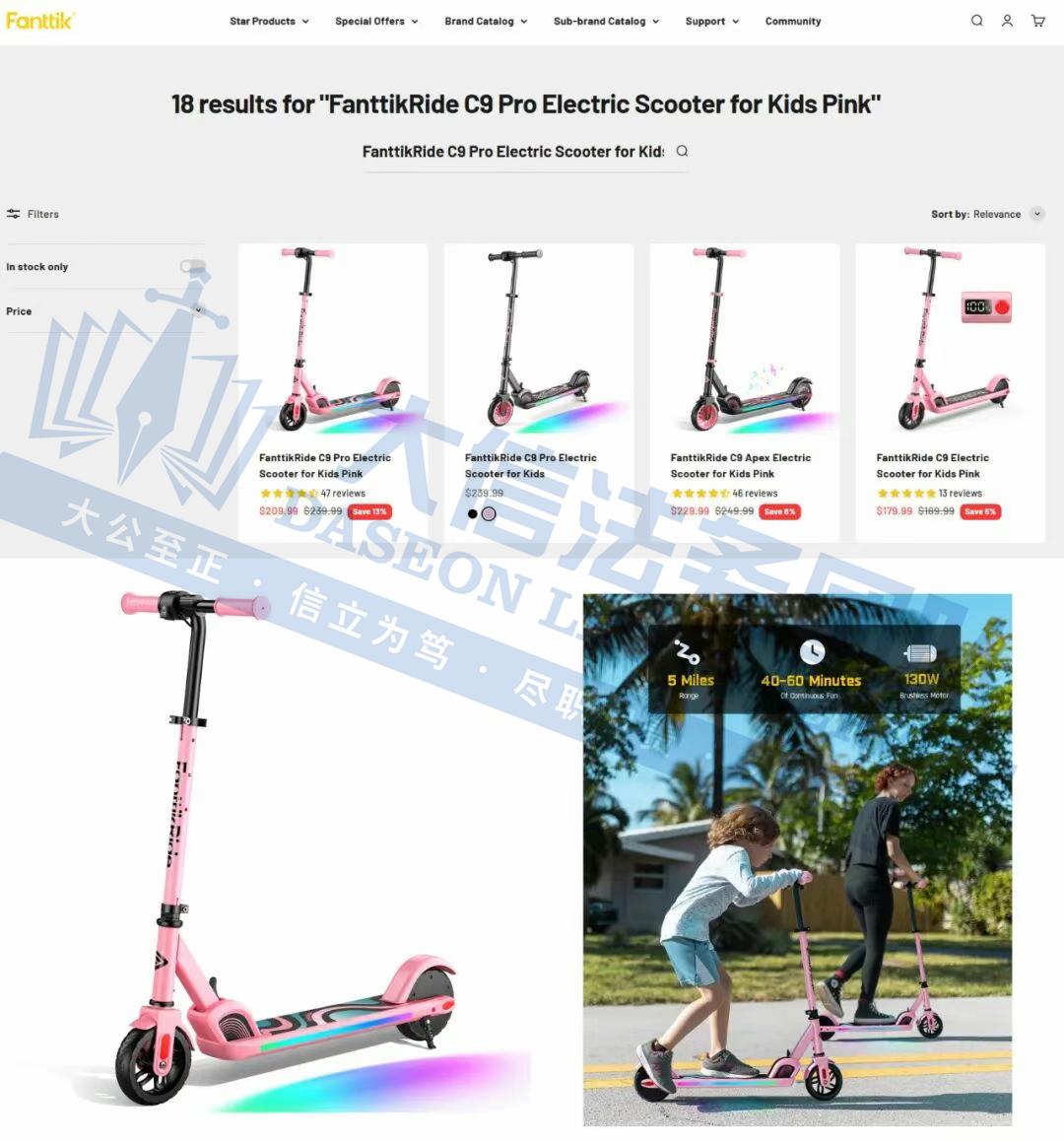 原告是一家全球化企业,主要售卖户外产品、智能出行及周边等产品。旗下有一款专为儿童设计的电动滑板车,该产品的的踏板旁设有闪烁的彩虹色LED 灯(有 5 种灯光模式),可以提醒其他车辆保持距离,采用三种变速设计(每小时 5 英里/8 英里/10 英里),LED 显示屏会随时显示电池电量、踏板模式和行驶速度。它能够一步完成折叠和展开,非常便于携带且易于存放。