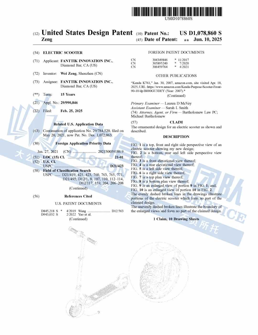 此案为专利维权,涉及一项外观专利,专利号:US D1,078,860 S,于2025年6月10日下证,要保护电动滑板车的核心外观,包括:整体轮廓把手、车身侧面线条、前轮及踏板等,以下是涉及专利的具体信息,未经授权不得擅自使用,侵权风险极高,跨境卖家尽快检索下架,避免TRO侵权风险!
