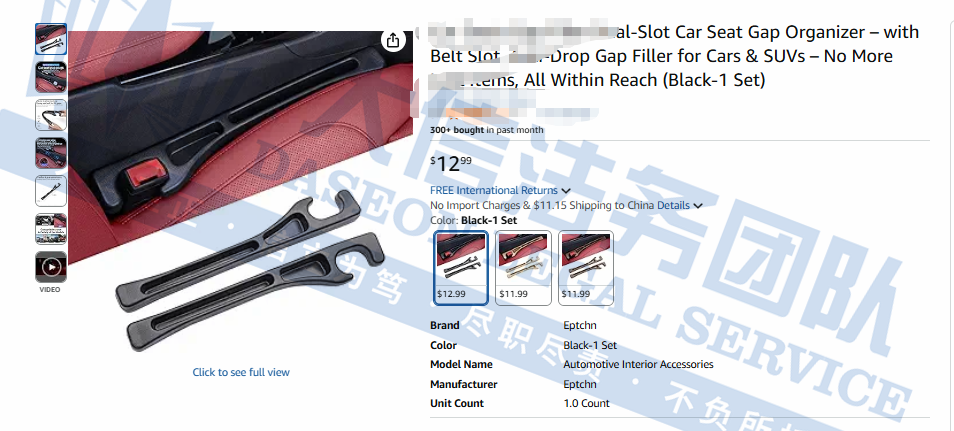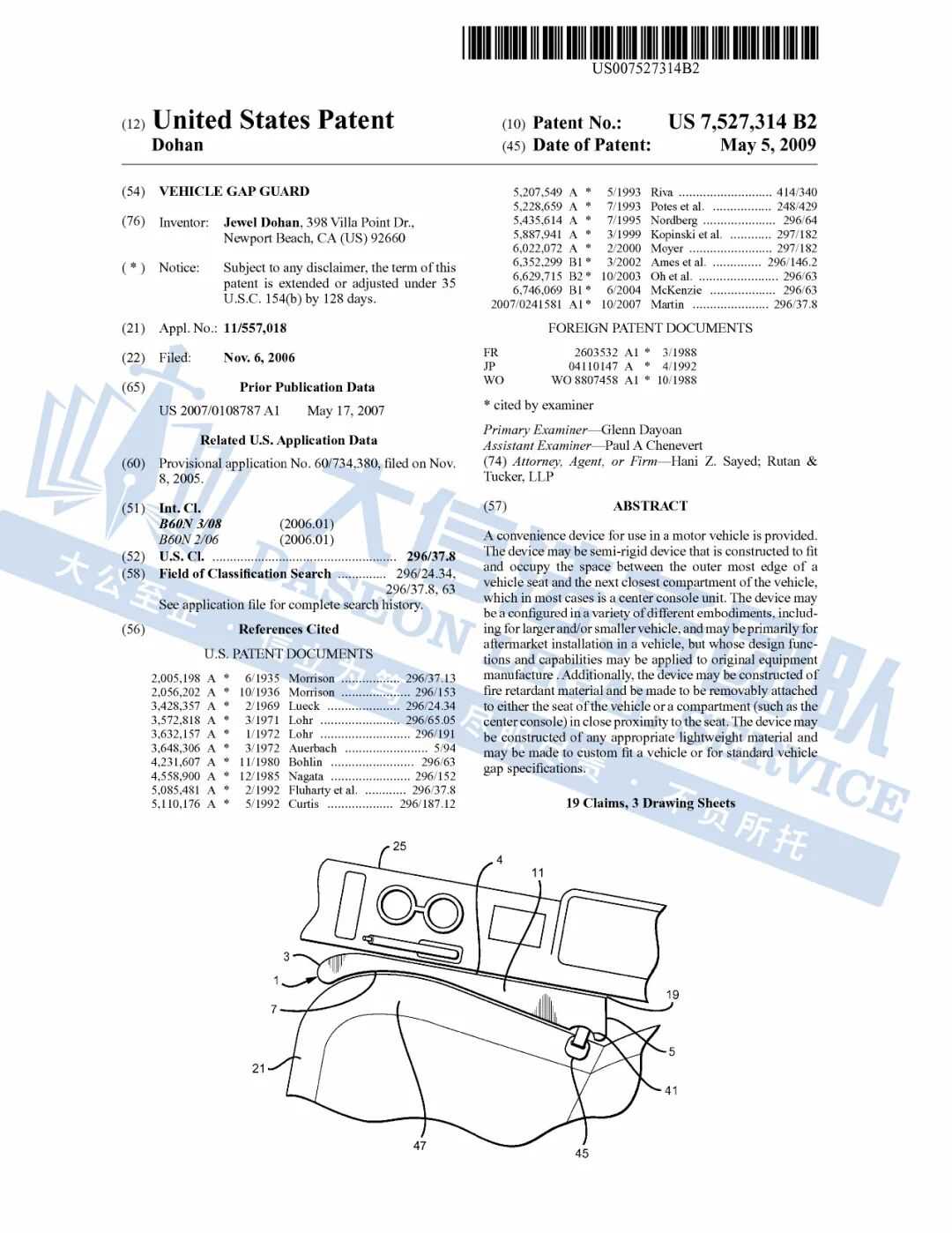 原告是来自美国,针对车辆座椅间间隙易致零散物品滑落、找物费时费力且驾驶操作危险的问题,设计出一款适配不同尺寸车辆的座椅间隙防护装置。该装置用轻质阻燃材料制成,易连座椅,轮廓适配、稍作调整即可稳固安装且紧密贴合,不干扰安全带及车辆机械功能,能防物品掉落,且适用于不同尺寸大小的车辆。