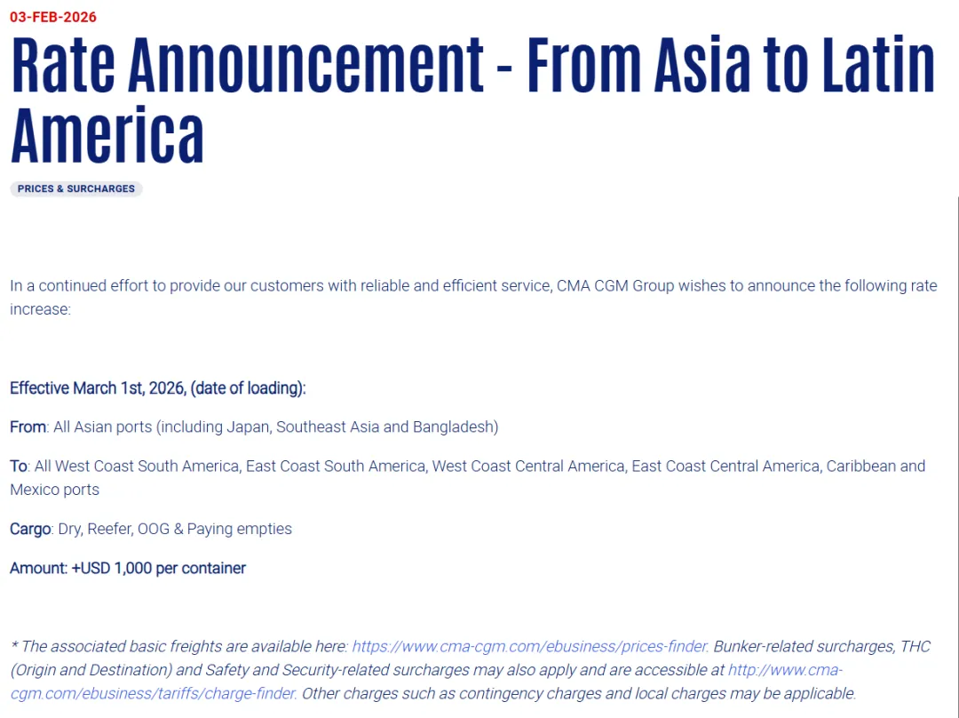 3月1日起直至另行通知,从远东基本港到南美西海岸、墨西哥、南美西海岸及中美洲的服务将实施一项新的综合费率上涨。