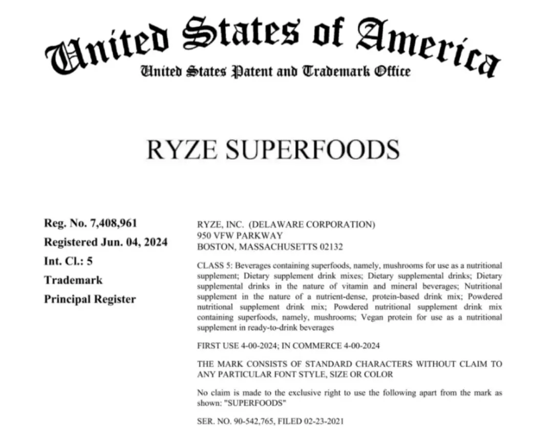 原告Ryze, Inc.2020年由哈佛校友联合创立,总部位于波士顿。主打蘑菇咖啡与抹茶系列健康饮品,以有机阿拉比卡咖啡融合六种药用菌,主打低咖啡因、自然提神,是健康膳食补充饮料领域的创新品牌。