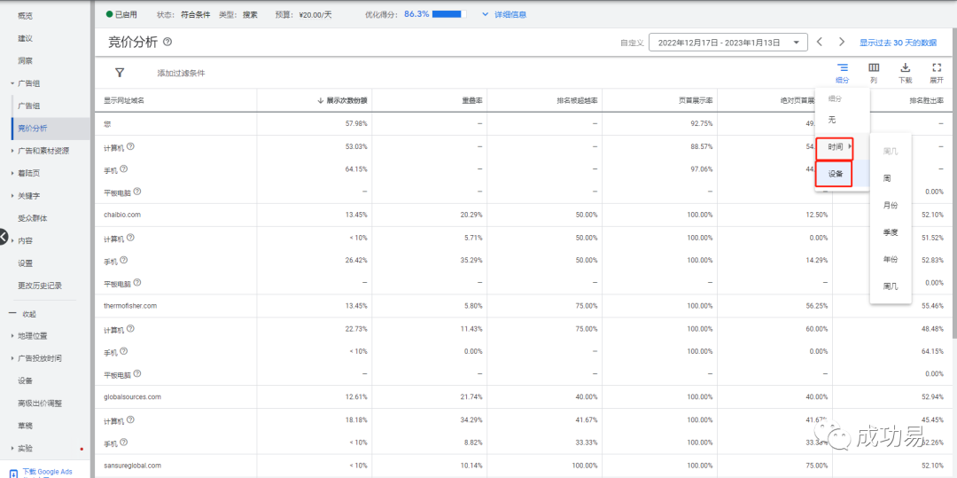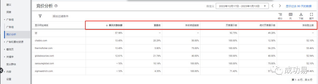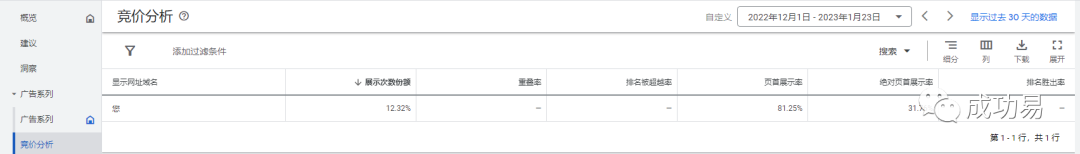 当广告处于直接竞争中,会向您展示谁的广告赢得了排名靠前的广告位。当两个广告同时展示时,另一个广告商的广告排名高于您的广告的比例是多少就是排名胜出率。因此,如果您看到竞争对手的排名高于30%,这意味着他们在你们都出现的30%的SERP(搜索引擎结果页面)中排名高于您。