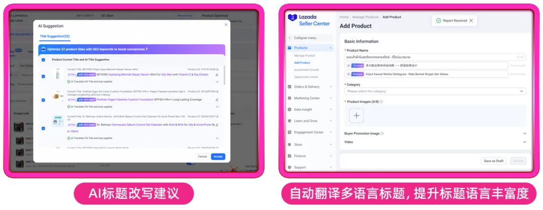 标题是商品曝光的第一入口。Lazada的本地化标题优化功能结合C端搜索词+AIGC,能为您的商品生成更符合当地消费者搜索习惯的标题。