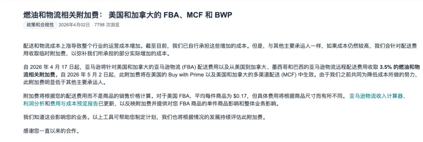从2026年4月17日开始,美国和加拿大的FBA配送费用,以及从美国发往加拿大、墨西哥、巴西的远程配送费用,将加收3.5%的燃油和物流附加费。 同时,从2026年5月2日开始,这项附加费也会应用到美国的Buy with Prime,以及美国、加拿大的多渠道配送(MCF)订单。