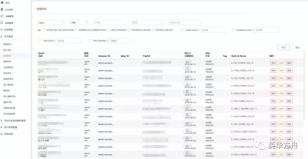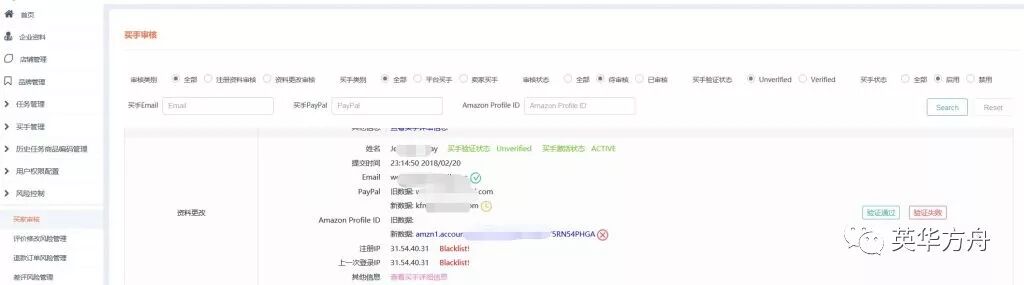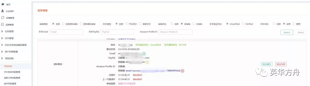 3、当有 买手选择了任务时,对买手进行审核,黑名单一看啊,隔离风险。