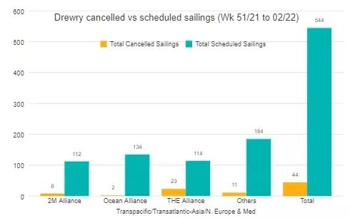 根据德鲁里日前发布最新数据,接下来的4周(第51-2周)里全球三大航运联盟陆续取消了多个航次,在跨太平洋、跨大西洋、亚洲-北欧和亚洲-地中海等主要航线总共544个预定航次中,在第51周至明年第2周之间取消了44个航次,取消率为8%。