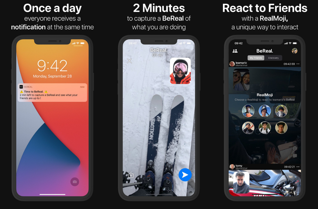 最重要的是,这个App没有内置滤镜,也不允许上传相册里的照片,用户每天在完全无预警的情况下收到通知,拍下无滤镜无修图的前、后镜头照。让用户褪下理想与完美的包装形象,打破社媒平台的虚伪不实,鼓励人们以最真实的样貌相互交流。