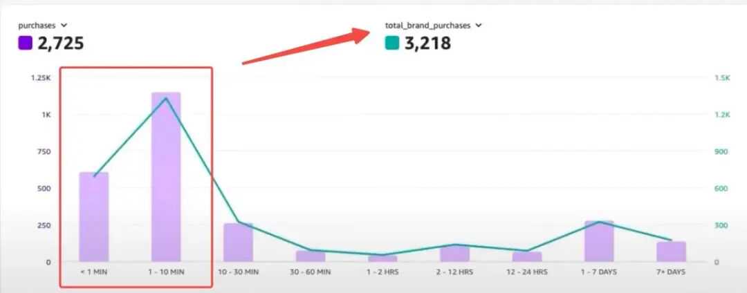 假如根据以上这个图,这是根据SP广告的受众表现聚合而得出来的结果,这个是直接用的亚马逊管饭给的模版,这个数据我们能告诉我们这些受众看到sp 广告之后有1分钟内进行购买的数量是在600单左右,10分钟内的有1.1K订单左右,另外我们可以看到这个表格的最后一个柱状图7+days 这个有可能30天 或者没到30天 ,所以这个也能侧面反应,详情页的内容很好,标题主图,以及五点,A+ 等等内容起到了关键作用,因此我们针对这群人再营销的时候不需要把太多的广告花费 分给retargeting ads。