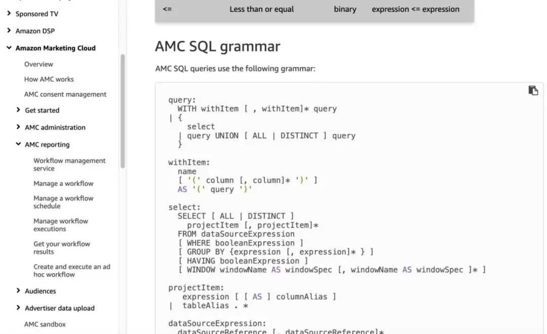 从定义来看,“AMC 是基于 SQL 的数据仓库,允许卖家对亚马逊平台的购物行为数据与广告表现数据进行自定义查询,从而获取更深入的业务洞察”。