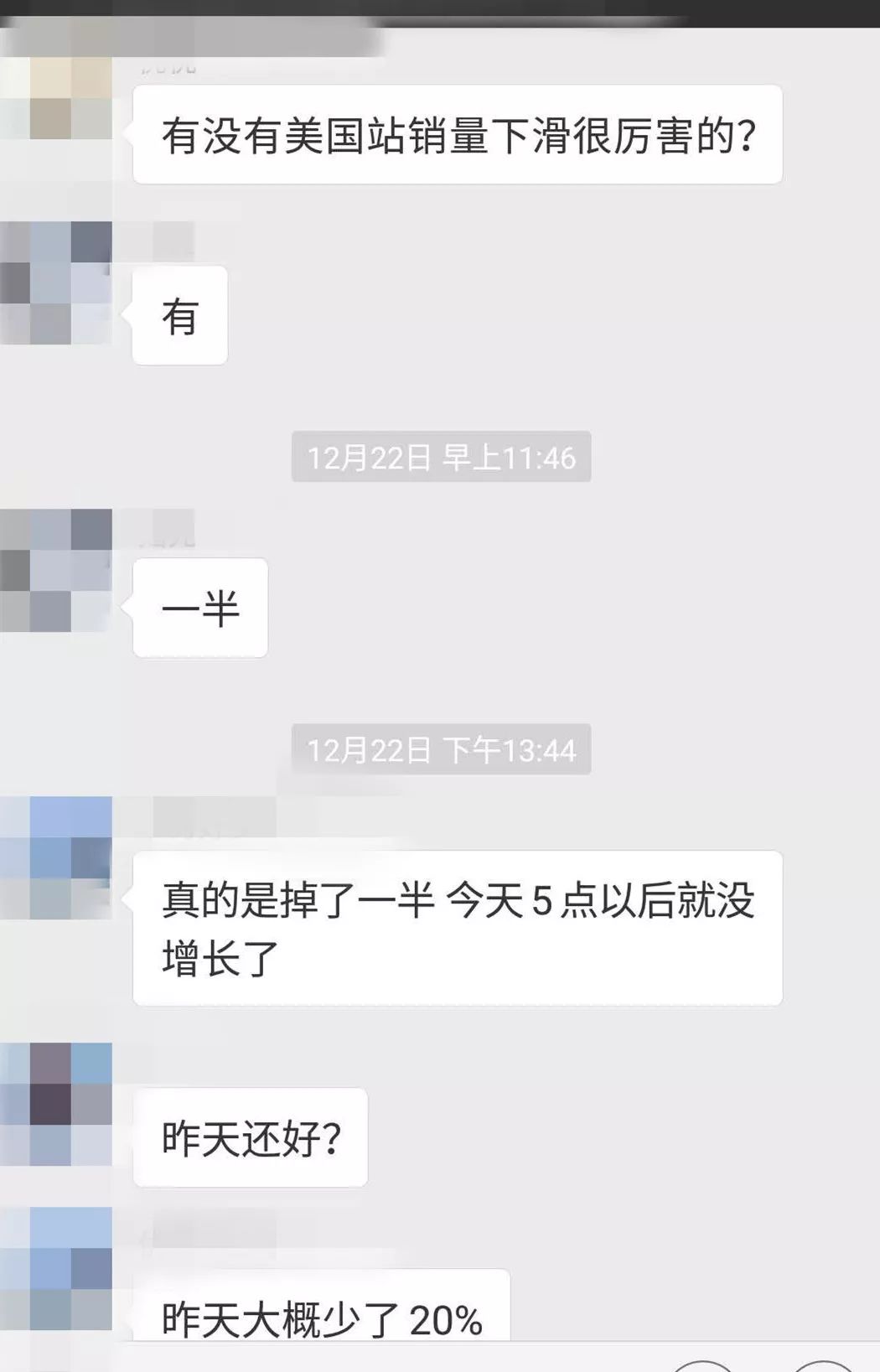一卖家在群里吐糟,美国站订单已经下滑已经50%了,不仅每天要被老板叫去谈话,年终奖也快凉凉了!而且今天下降更严重,一直在跌,所有账号一下子都下降了一半。