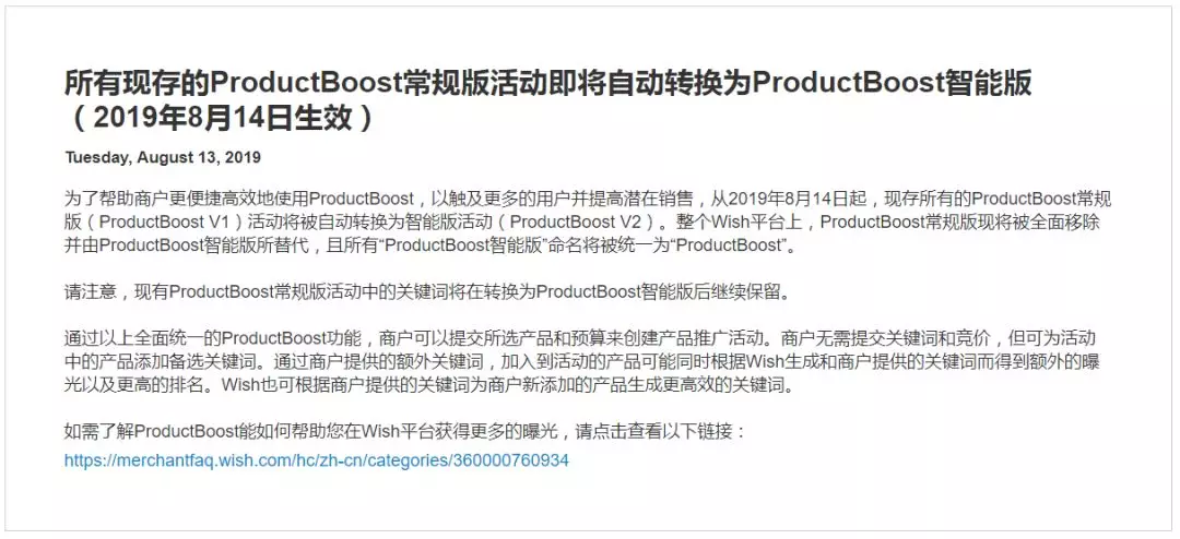如果你的PB活动是在7月31日前创建的循环更新的常规版PB活动,且更新时间是在7月31日及之后,活动在之前是会保持其创建时的初始版本(即常规版),但是从8月14日起,该活动也将被自动转换为智能版活动;后续,ProductBoost的名字也会统一成为ProductBoost产品推广哦~关于ProducBoost常规版活动全面被智能版取代的更多说明,你可以点击这里查看哦~你也可以访问https://merchantfaq.wish.com/hc/zh-cn/categories/360000760934 查看ProductBoost的详细说明哦~