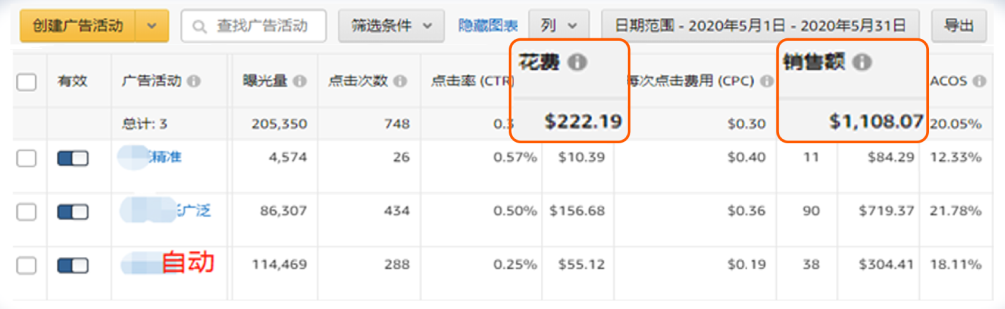 从上图可以看到,该卖家的广告花费$222.19,广告销售$1108.07,由此可得: