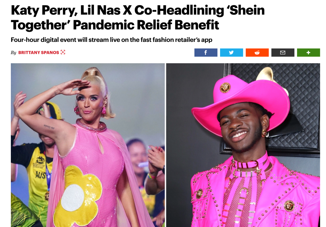 在海外爆火的时尚电商SHEIN成为了中国品牌出海标杆,它在2020年公布的中国出海TOP50的榜单中位列十三。SHEIN紧抓国内强大的供应链和利用海外的社交媒体进行营销,每天对消费者推出的数十种超低价服装和配饰,收揽了大波固定客户群体。在2020年5月,同时邀请了海莉·比伯(Hailey Bieber),丽塔·奥拉(Rita Ora)等众多明星参加了其组织的#SheinTogether活动。