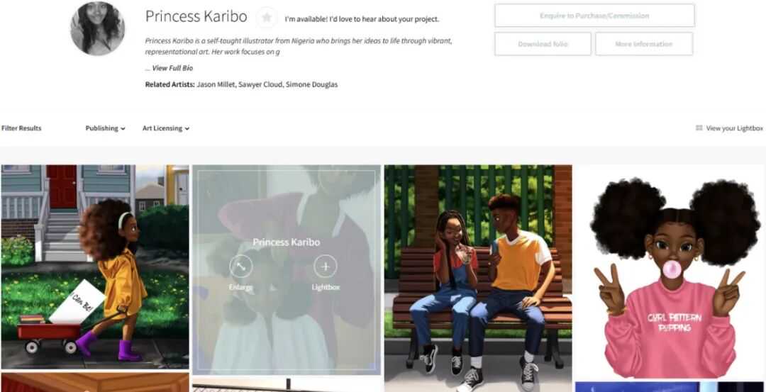 原告Princess Karibo是一位来自尼日利亚的插画家,她的作品以黑人女性为主题,展现了她们的美丽、力量和多样性。Karibo希望通过她的插画为黑人女性群体发声,传达她们的故事和经历,让世界看到黑人女性的独特魅力和价值。