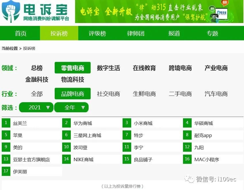 据“电诉宝”2021年受理的品牌电商领域用户有效投诉显示,入选投诉榜依次为丝芙兰、华为商城、小米商城、华硕商城、苹果、三星网上商城、特步、耐克APP、美的、波司登、李宁、九阳、亚瑟士官方旗舰店、NIKE商城、良品铺子、MAC小程序、伊芙丽。