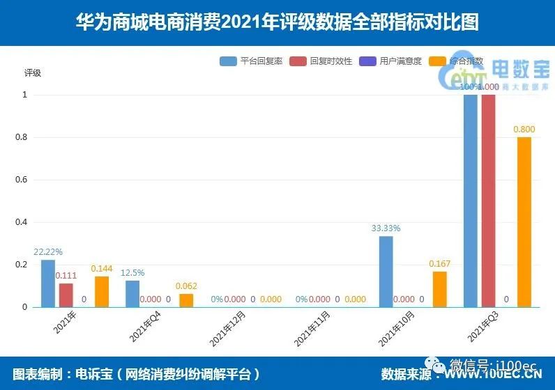 2021年全年,“华为商城”平台回复率为22.22%,回复时效性为0.111,用户满意度为0.000,综合指数为0.144。