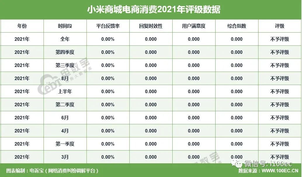 据网经社旗下电商大数据库“电数宝”监测数据显示,2021年“小米商城”共获得10次消费评级,均获“不予评级”。同时,“小米商城”存在退款问题、发货问题、售后服务、退换货难、霸王条款的问题。