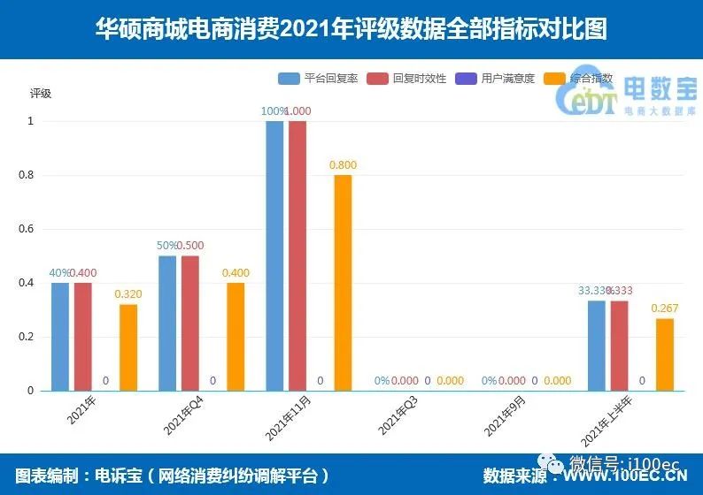 2021年全年,“华硕商城”平台回复率为40.00%,回复时效性为0.400,用户满意度为0.000,综合指数为0.320。
