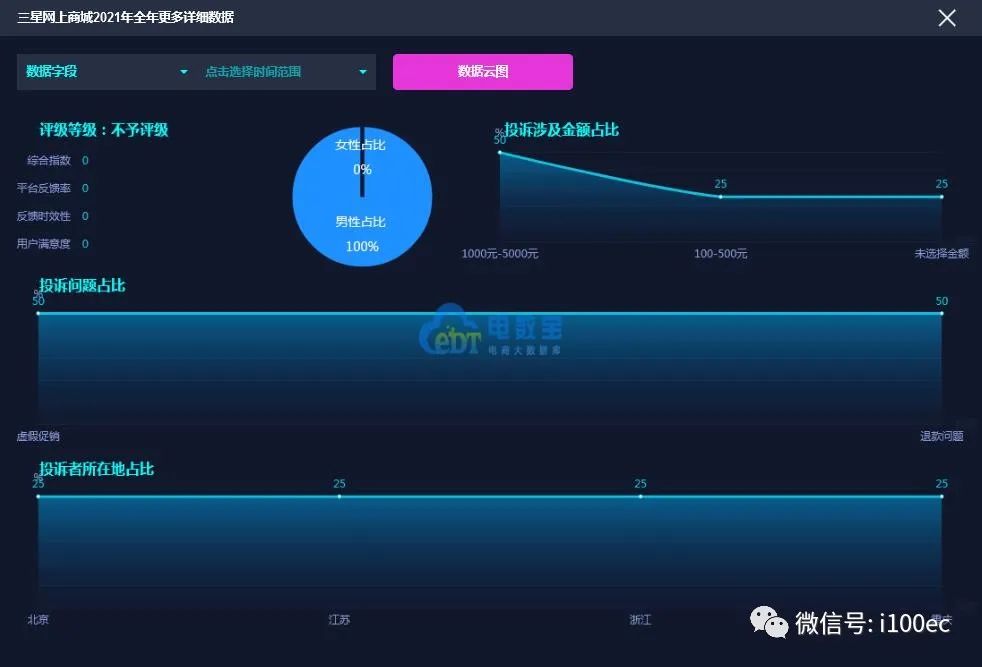 据网经社旗下电商大数据库“电数宝”监测数据显示,2021年“三星网上商城”共获得9次消费评级,均获“不予评级”。同时,“三星网上商城”存在虚假促销、退款问题的问题。