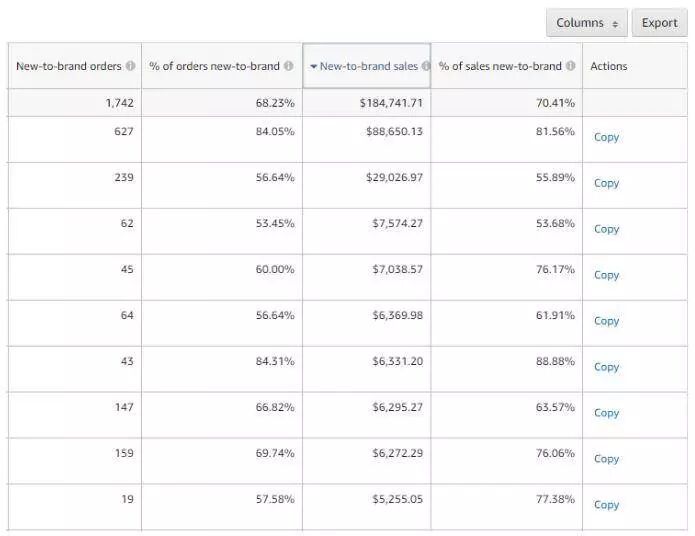 “New -to-brand”指标会告诉广告商通过广告产生的订单是来自现有客户,还是过去12个月来首次购买该卖家产品的客户。该指标旨在帮助在亚马逊上投放广告的卖家分析广告活动中的新客户数据。它适用于亚马逊视频广告、展示广告和Sponsored Brands广告。