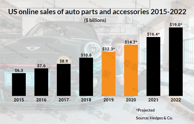 卖家之家还了解到,据Hedges & Co称,在互联网零售商前1000强中排名第一的亚马逊公司预计将在2019年销售价值63亿美元的汽车零部件、配件和汽车护理产品,以及由原始设备制造商(oem)生产的价值16亿美元的替换零部件,使其总销售额达到近80亿美元。
