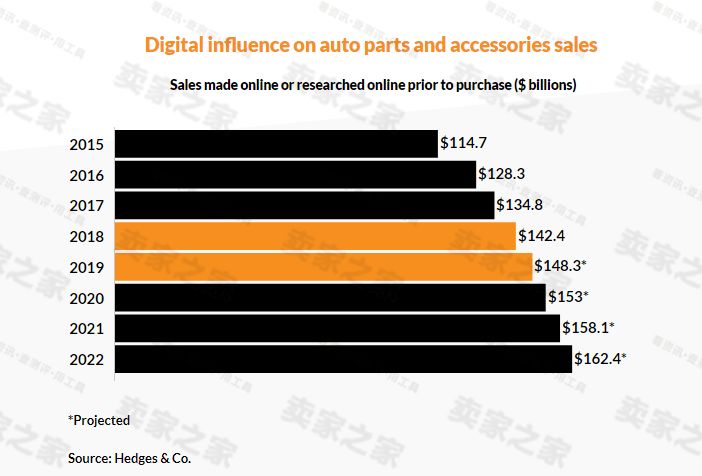 分析报告称,今年美国汽车零部件销售总额将超过1,480亿美元。这些“数字影响”的销售包括网上购买的商品,以及在商店购买前在网上研究或发现的商品。Hedges & Co预计,到2022年,美国汽车零部件和配件的在线销售额将达到190亿美元,受数字影响的销售额将增至1624亿美元。