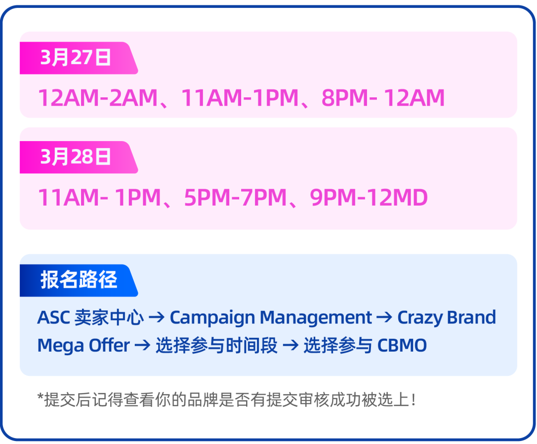 相信LazMall商家对于BMO应该再熟悉不过,而大促期间的CBMO超级品牌特惠更是通过加大优惠和限时进入的方式引导更多消费者下单成交,是LazMall商家大促期间提升销量的最佳拍档之一。本次菲律宾站点的CBMO共设六个时段,商家朋友们赶紧做好笔记提报~