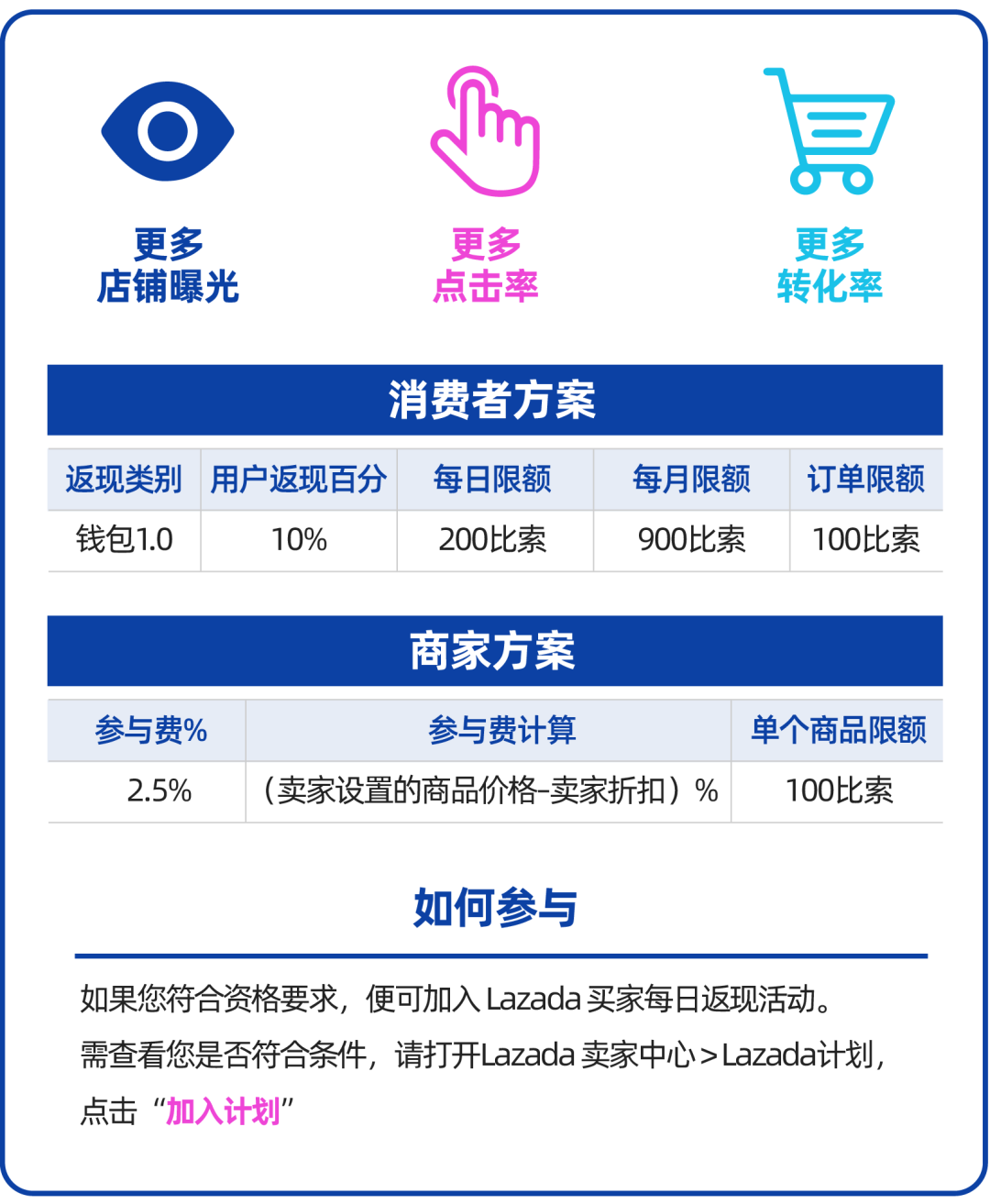 大促期间,更多用户流量来到Lazada,拥有首页展示的机会更是完成店铺等级跃升的好机会。作为大促期间主流的活动呢之一,Lazada Bonus享受六大绝佳展示坑位,强力提升商品及店铺曝光度和流量。同时收集优惠的机制配合多件多折,更鼓励消费者多次浏览、加购,提升店铺粉丝粘性,给予GMV和客单价提升最大的支持!