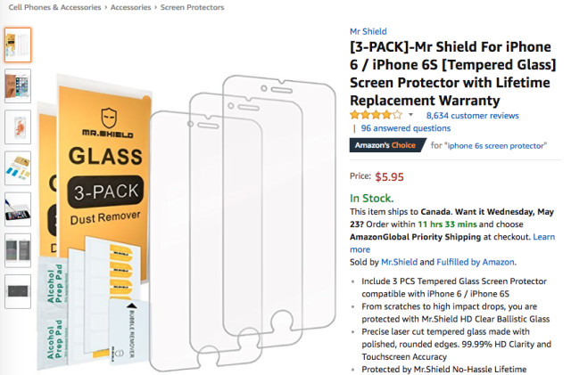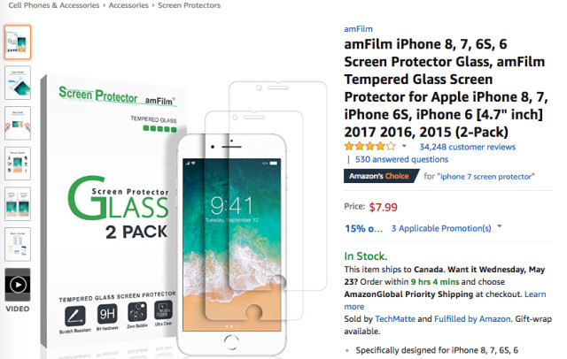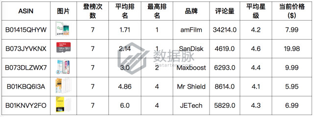 可以看到,在上周Cell Phones & Accessories品类的Best Seller榜单中,几款老牌的手机屏保护膜产品再次占据了商品综合排名的前列——其中,来自品牌amFilm的iPhone 6~8系列手机屏幕保护膜产品在上周三度位居Best Seller榜单首位,获得了1.71的平均排名;