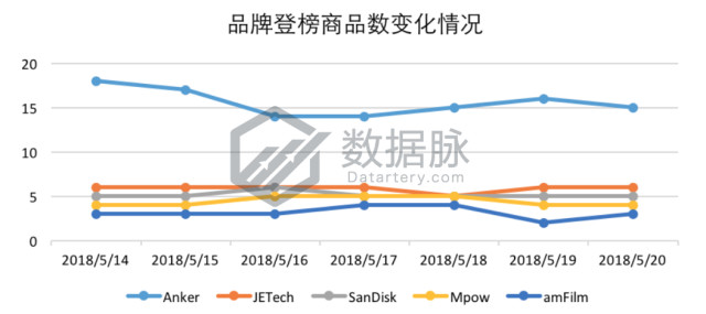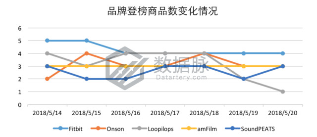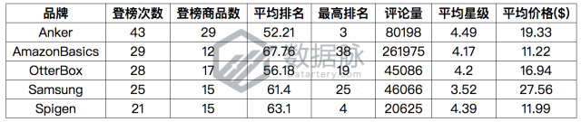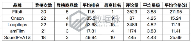 根据上周Movers & Shakers榜单上各个品牌下商品的登榜次数,我们对登榜的品牌进行了排序,其中排名靠前的五个品牌如下所示: