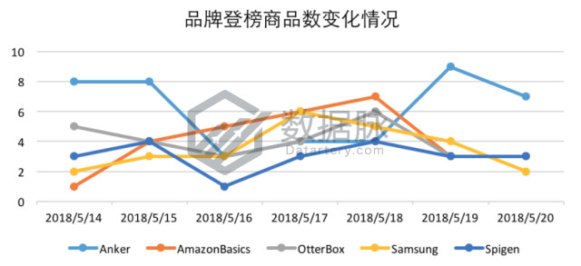 在上周Cell Phones & Accessories品类的Movers & Shakers榜单的品牌竞争中,品牌Anker凭借在5月14日、15日、19日、20日四天中的突出榜单发挥,一举夺下了该周最多的登榜次数43次,再次从激烈的榜单 竞争中杀出重围,领先于该周进榜次数29次的亚马逊自营品牌AmazonBasics,位居品牌综合排名第一。同时,几个我们常见的品牌“熟面孔”—— OtterBox、Samsung、Spigen也在上周成绩稳定,分别位列品牌综合排名的第三、四、五名。