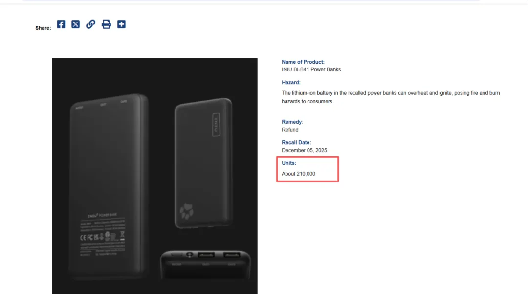 INIU的遭遇并非个例,2025年以来,充电宝行业已陷入“召回潮”。