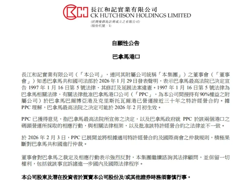 2月4日,长和在港交所公告称,巴拿马港口公司(PPC,为本公司间接持有90%权益之附属公司)已获得意见,指巴拿马最高法院所宣布的决定,以及巴拿马政府就PPC于该两个港口之码头营运所采取的相应行动,与相关法律框架,以及批准该特许经营合约之法律并不一致。