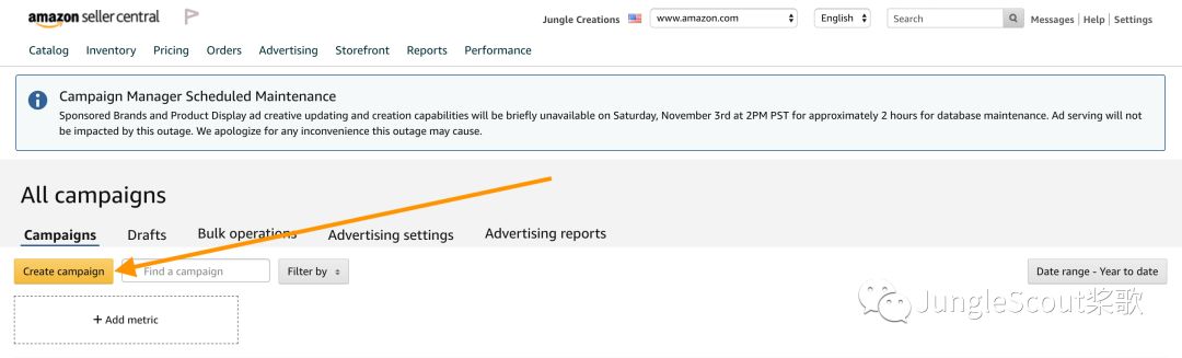 首先让我们创建一个广告活动:进入亚马逊卖家中心,选择Advertising->Create campaign
