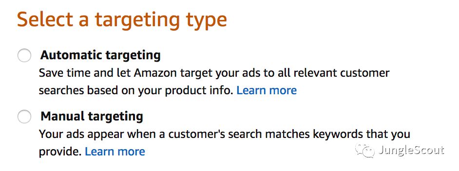 注意,第一次创建亚马逊PPC广告时,小歌推荐同时创建两个广告活动:一个是“Automatic targeting”(自动投放)广告,由亚马逊决定在哪个搜索词下显示产品广告; 另一个是“Manual targeting”(手动投放)广告,由卖家自己选择关键字来展示广告,如下图: