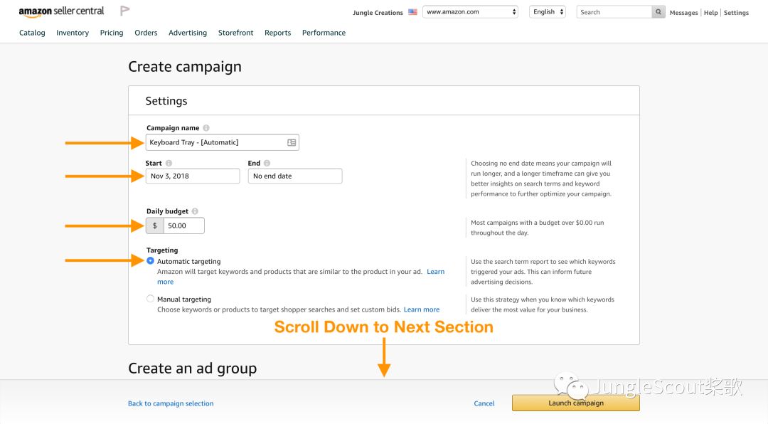 自动投放广告非常容易创建,只需输入广告活动的名称、预算和开始日期(下图箭头所指的位置)即可。它的工作原理是,亚马逊将从产品列表中抓取产品的信息并在预算范围内帮卖家投放广告。亚马逊根据卖家的商品信息,决定关键词、出价和关键词匹配类型。