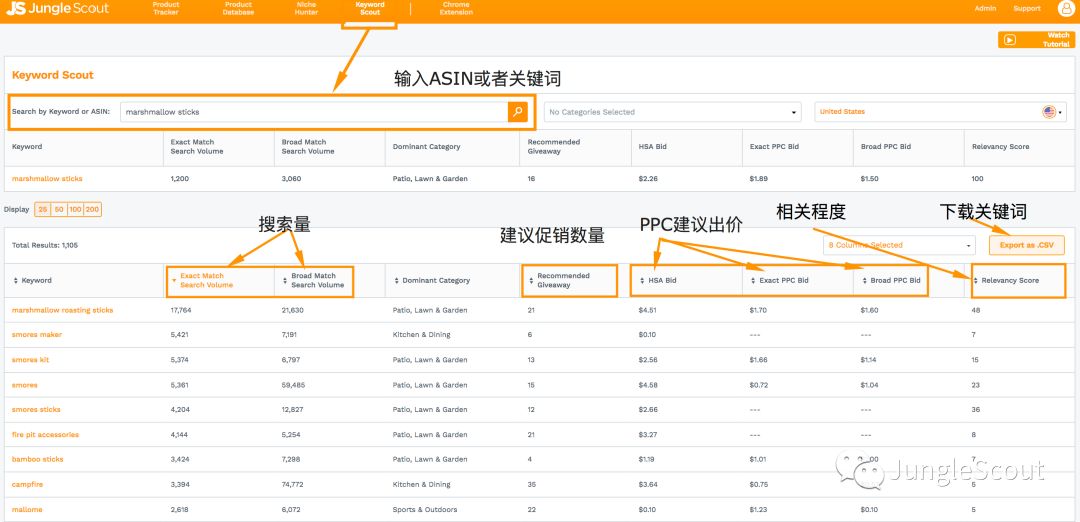 JS网页版应用程序中自带的关键词神器Keyword Scout除了可以输入一个关键词,然后查找到更多的关键词之外,还提供了关键词在亚马逊平台的搜索量(广泛匹配或精准匹配),以及建议PPC广告出价,这对于设置和管理PPC广告活动来说具有极高的参考价值!