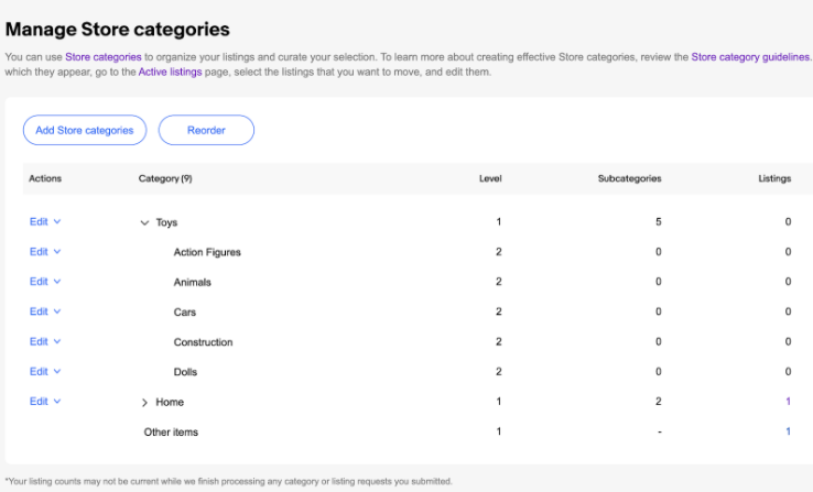 eBay 还重新设计了“商店类别(Store categories)”页面。新的店铺类别页面可以让卖家,在同一个页面上同时查看和管理所有的商品分类,从而有助于减少卖家停留在类别的创建和整理上的低效率体验。