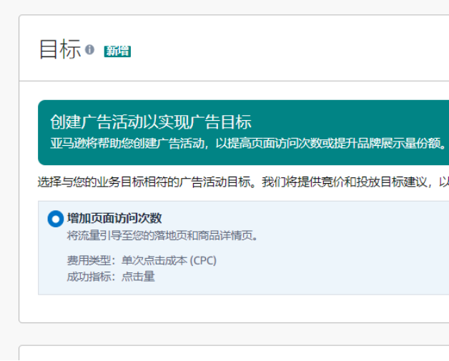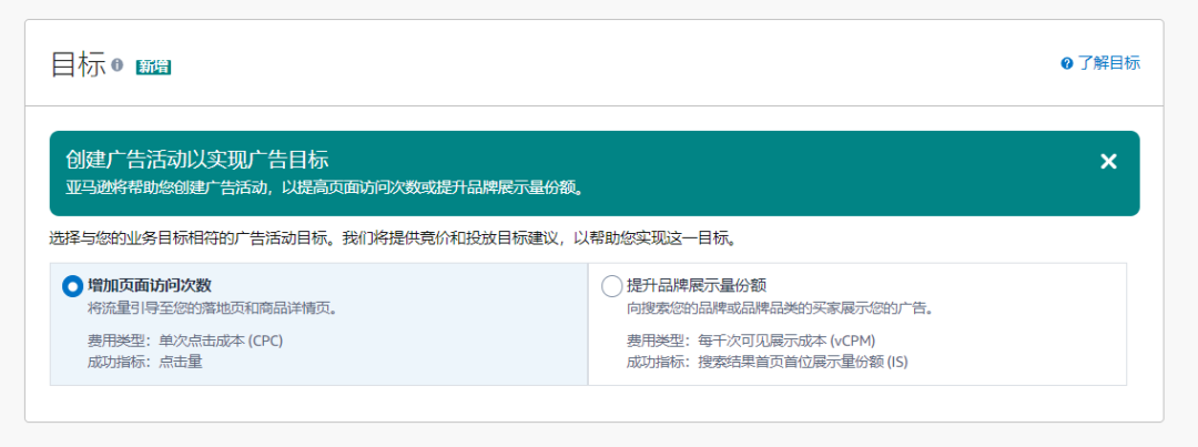在广告平台创建“品牌推广广告”时,新增了广告活动“目标”设置,卖家可根据生意目标,“二选一”选择对应的广告目标: