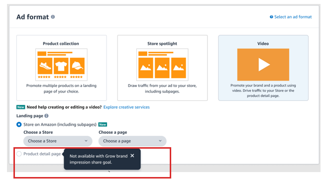 Tips:选择不同的广告目标后,支持的创意格式有所不同,主要区别为:“提升品牌展示量份额”目标下,只能导流至品牌旗舰店。