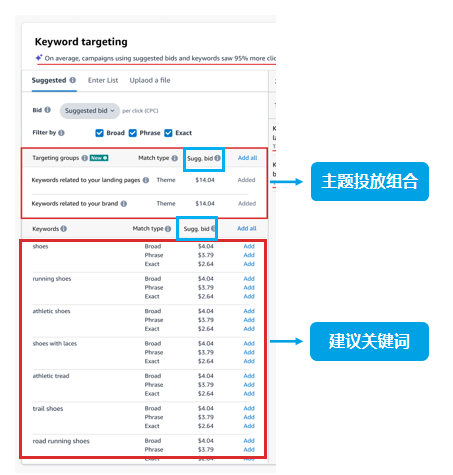 & 每个主题投放组合均有建议竞价(suggest bid),推荐参考“建议竞价”设置竞价