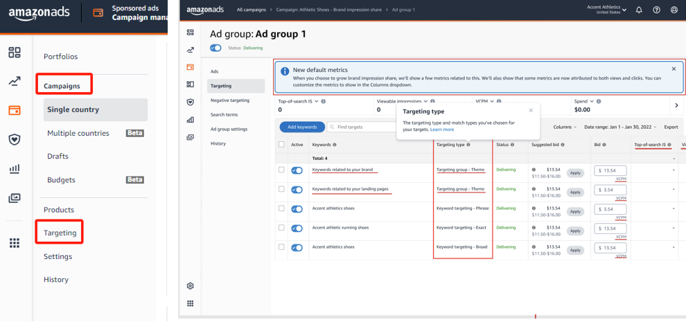 主题投放组合(Targeting Group):在关键词定向(Keyword targeting)环节,卖家可以根据选定的广告目标,选择系统推荐的“主题投放组合”,高效投放关键词广告。