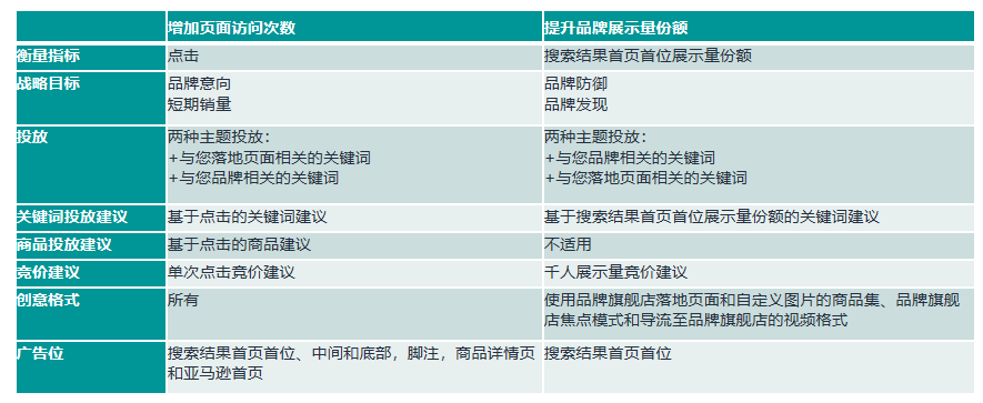 进入广告平台,进入“品牌推广广告”的创建流程,在“目标”设置中,分别选择“增加页面访问次数”或“提升品牌展示量份额”,参照以下表格比较在关键词、竞价和创意格式上的异同。