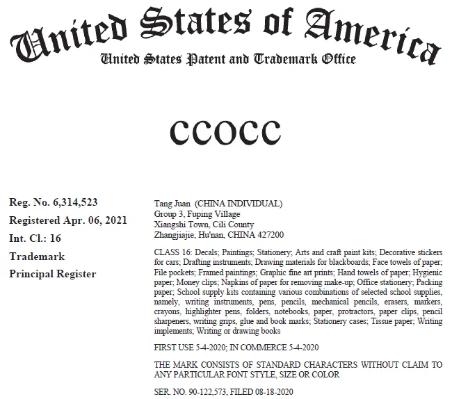 原告 ALBION BRAND FOUNDRY LTD 是一家在英国成立的私人有限公司,案件涉及文字商标 CCOCC,主要注册在第16类办公用品:贴花;绘画作品;文具;工艺绘画套装;汽车装饰贴纸;绘图仪器等。