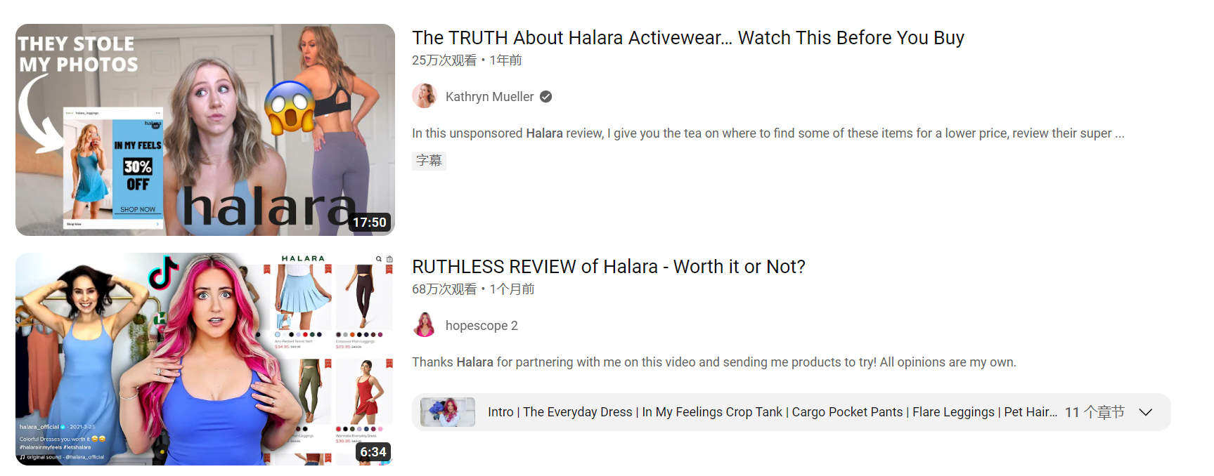 在其TikTok官方账号上,视频大多采用身穿Halara的产品,与Tik Tok上热门的视频类型结合,运用诸如跳舞、剧情、搞笑、换装等形式进行轮番“轰炸”,把运动产品完美地融入到年轻人的时尚潮流之中。在YouTube平台,虽然Halara的官方账号仅有8千多粉丝,但铺天盖地的KOL、KOC营销也是将Halara的人气推到了一定高度,大量视频发布了用户购买Halara并试穿的视频,通过细致且走心的介绍,播放量高达几十万。