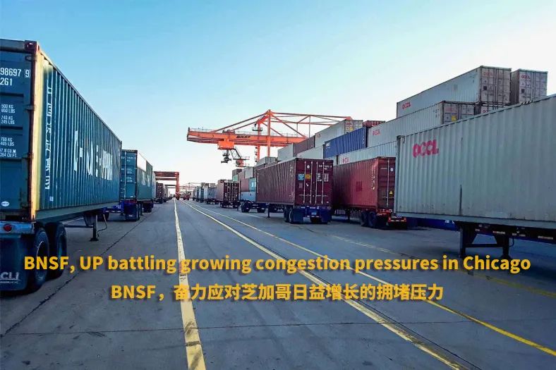 ②BNSF / UP 站场车架短缺严重,到站货柜被堆叠在站场超过十天。