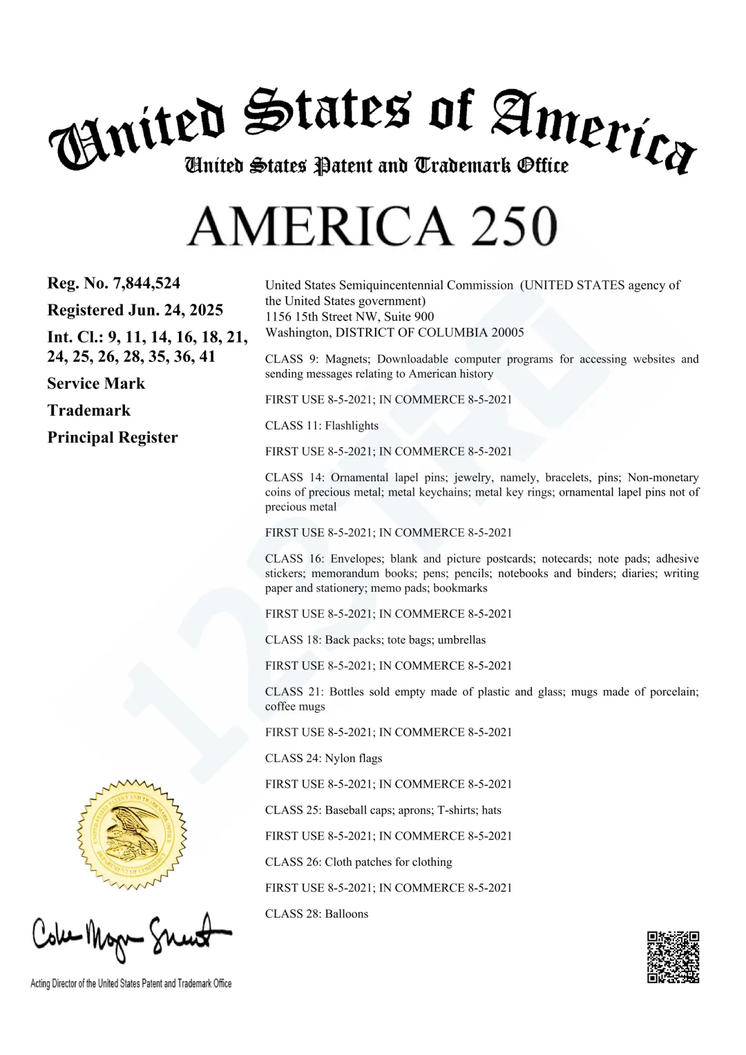 Reg. No. 7,844,524的注册类目:9 类(磁铁);11 类(手电筒);14 类(珠宝等); 16 类(文具);18 类(背包);21 类(杯子); 24 类(旗帜);25 类(服饰); 26类(布料);28类(气球);35-36类(筹款服务);41类(娱乐服务)