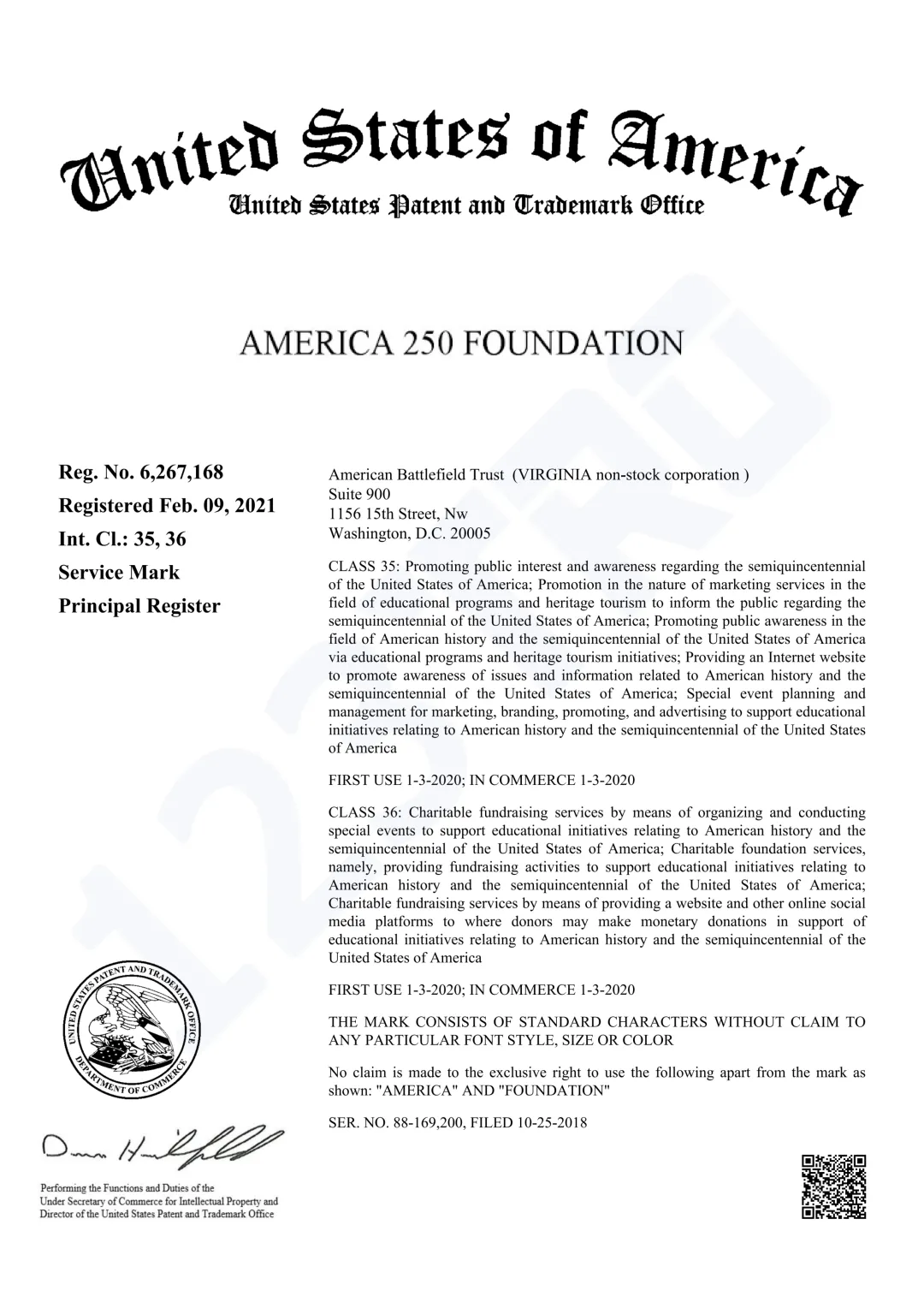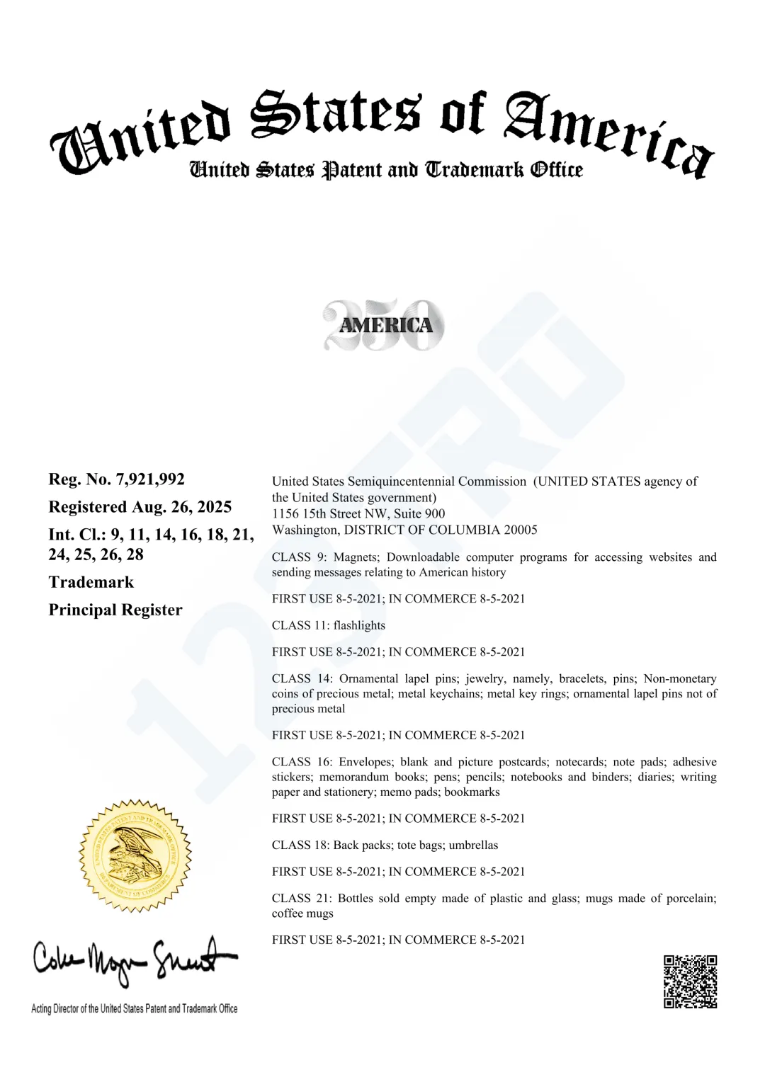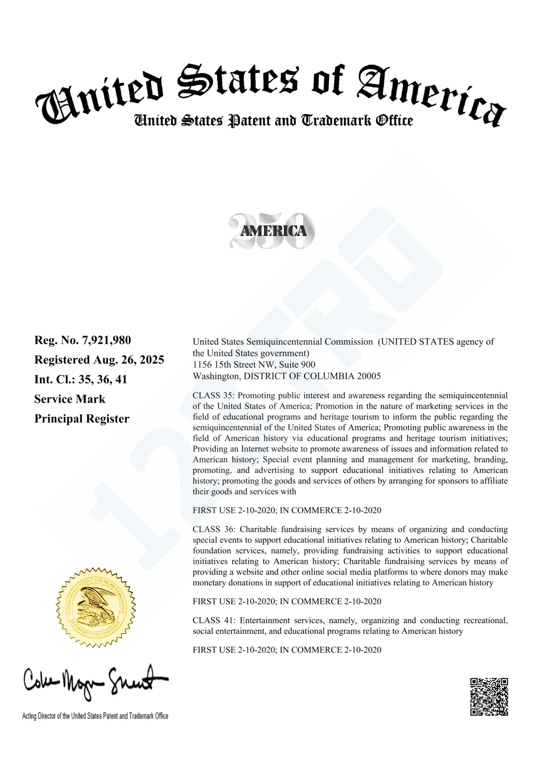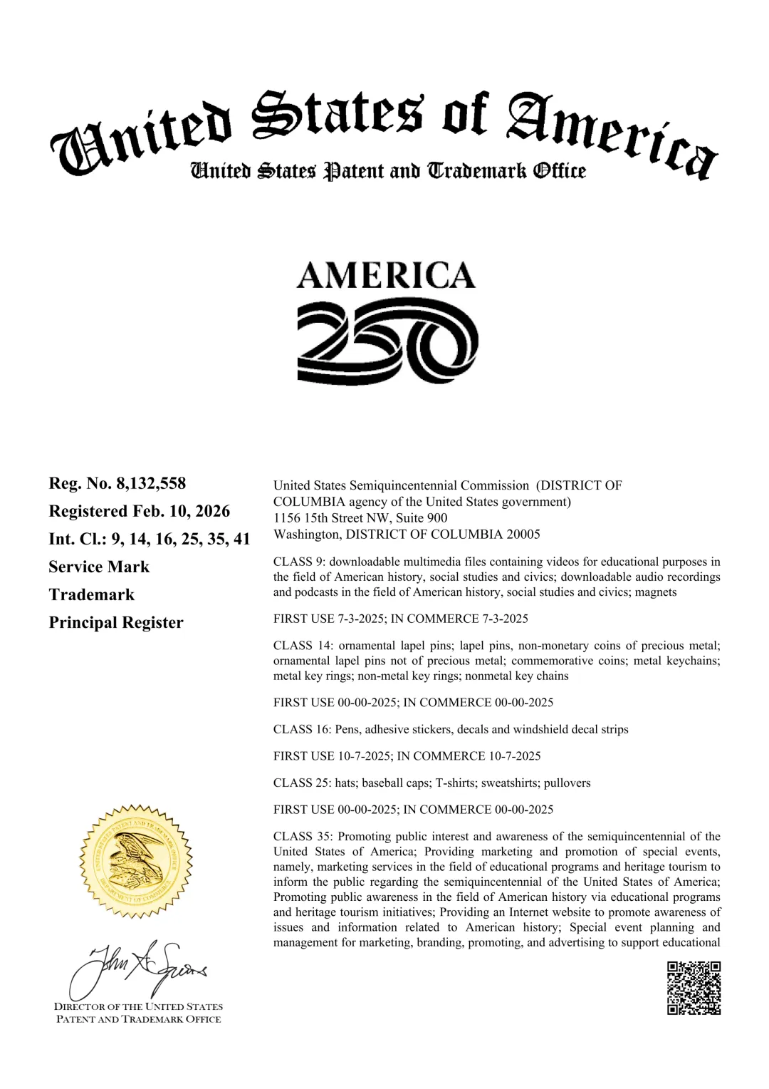 持有人:United States Semiquincentennial Commission