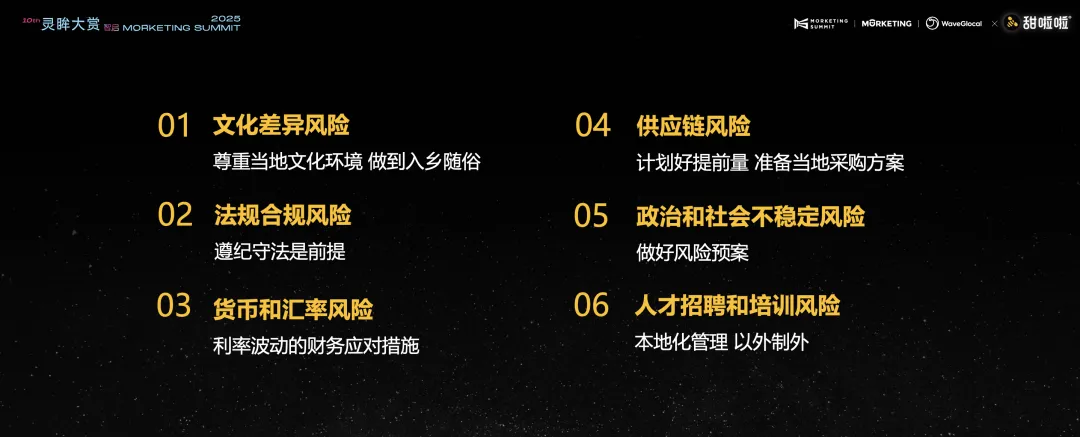 总结来说,出海有六个风险需要关注,其中有三个是绕不开的关键门槛:一是标准化与本土化的平衡,到底该双轨并行,还是全国统一,怎么确保贴合当地口感需求;二是供应链的跨国考验,这不仅是对供应链能力的挑战,还涉及法律法规等诸多突发状况;三是文化差异的适配,我们是把茶饮产品升级为文化体验,还是用世界能听懂的语言讲述中国茶饮故事。