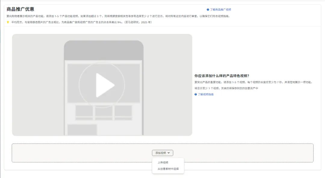 硬性参数:格式为 MP4/MOV,时长≥7 秒(建议 8-15 秒,避免过长导致用户划走),文件大小≤500MB,画面比例 16:9,可以展示1个或多个独特的商品功能。每条广告每次至少可以显示 2 段商品功能视频,并且您可以为每个商品上传最多 5 段商品功能视频。